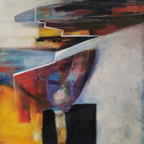 This collection of pieces are responses to the poem Yesterday, posing questions and seeking answers to the dilemmas we face as humans in a climatic crisis. I am striving to express the positivity possible if we work together. I use colours, textures and compositional forms to suggest these narratives.